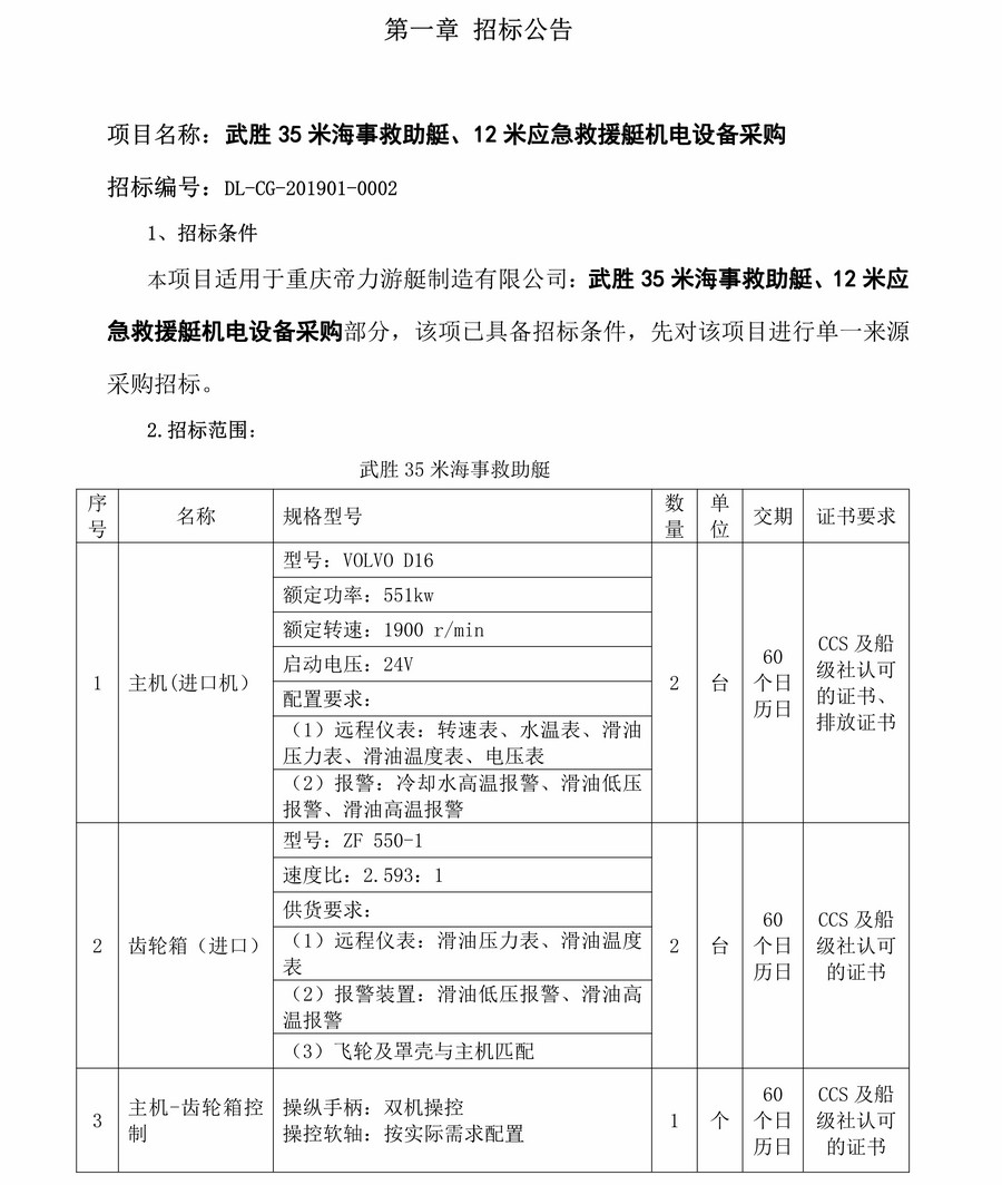 武勝35米海事救助艇、12米應(yīng)急救援艇機(jī)電設(shè)備采購(gòu)