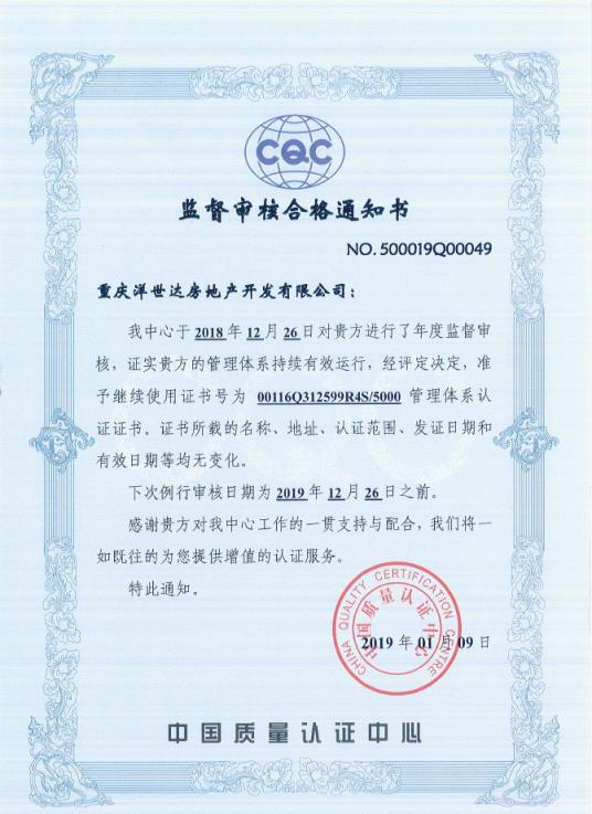 重慶洋世達房地產開發有限公司通過CQC2018年度監督審核