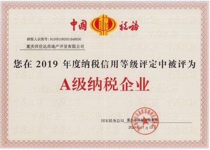 重慶洋世達實業(集團)有限公司、重慶洋世達房地產開發有限公司在2019年度納稅信用等級評定中被重慶市南岸區稅務局評為A級納稅企業。