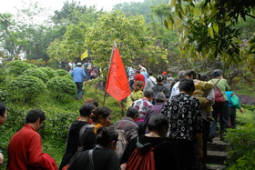 在登山活動過程中,物管公司特別悉心地在沿途每個轉角、岔路處設置了服務點,為參加活動的業主提供引導、簡單藥品,同時鼓勵、伴隨業主前行。業主按樓棟分為十個小組,龐大的隊伍井然有序,大家攜老扶幼快樂前行。時而歡聲笑語,時而駐足欣賞雨后沿途的美景,好不熱鬧。大家一邊登山還一邊聊天拉家常,結識了不少新朋友。最后,大家在印有“健康生活 源自運動”字樣的橫幅上簽名,并合影留念。