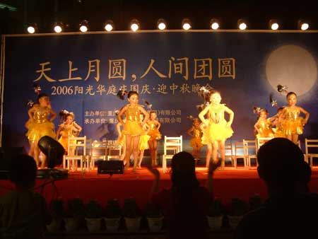 國慶中秋兩節遇,合家團圓精神俱。2006年9月28日晚19:30,“陽光華庭”一期大門口熱鬧非凡,華燈璀璨。“天上月圓、人間團圓--陽光華庭2006慶國慶迎中秋文藝晚會”在這里隆重舉行,來自小區的上千名業主觀看了此次晚會。