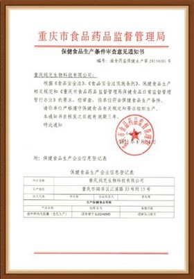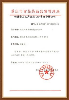 2015年8月,重慶純芝生物科技有限公司取得由重慶食品藥品監督管理局頒發的《保健食品生產企業GMP審查合格證明》和《保健食品生產條件審查意見通知書》,順利通過了保健食品良好生產規范GMP(2015)002認證。同時,經國家食品藥品監督管理局批準,取得保健食品國食健字G20140945生產許可批文。